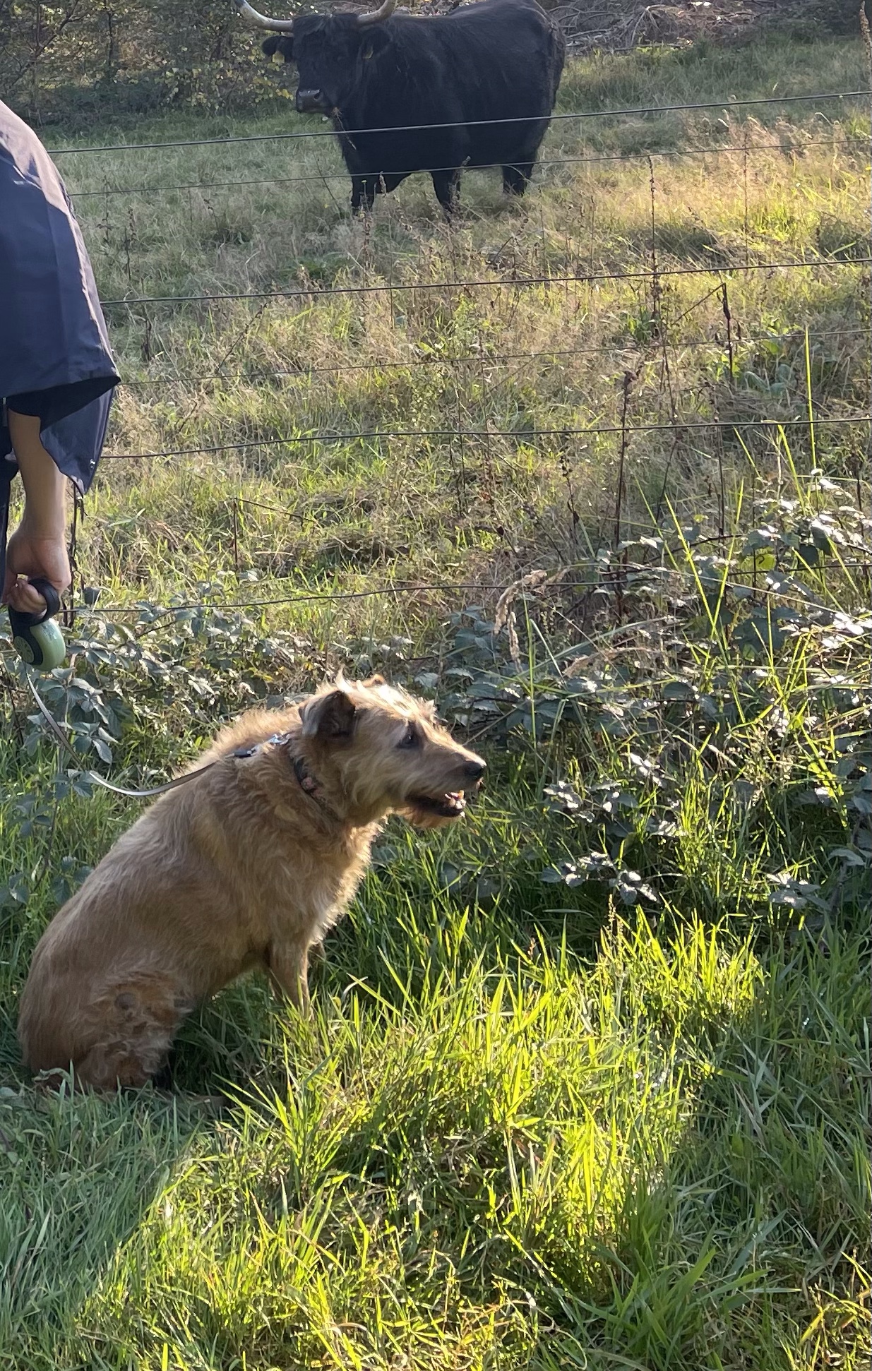 Heute bin ich mit meinen Menschen in einem Wildtiergehege gewesen. Natürlich hatte mein Frauchen mal wieder Angst. Und Herrchen? Der schlenderte völlig tiefenentspannt mit mir durchs Gebiet. Zum Glück bot Herrchen sich ritterlich an, sich als erster von den Rindern verspeisen zu lassen. Bei ihm ist ja auch mehr Fleisch dran😉
